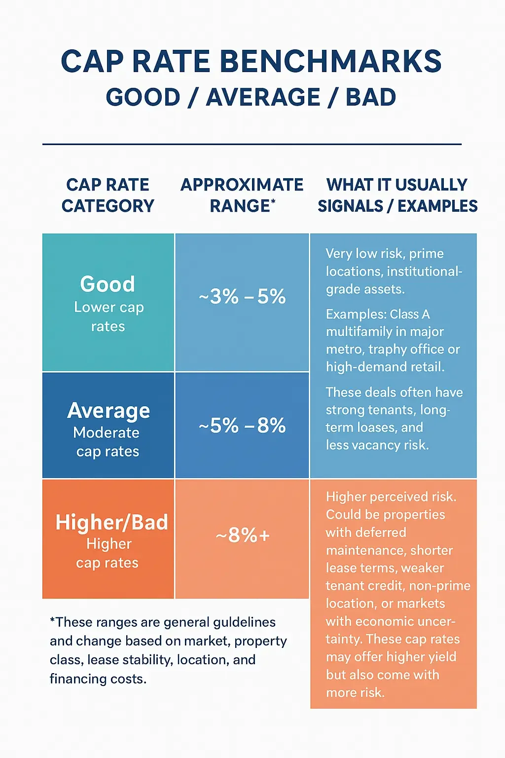 Risk Assessment – Higher cap rates often mean higher perceived risk (secondary markets, older assets, less stable tenants). Lower cap rates signal lower risk (prime locations, strong tenants).